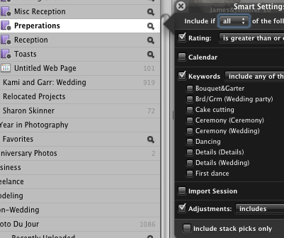 3. Smart Albums: As with iPhoto and iTunes, the Smart Album feature of Aperture is practically all you need to keep your photos managed. This feature works the way it does in iPhoto, but it offers many more options for configuring smart albums. Once you're familiar with all the metadata embedded within your digital files, you can simply use smart albums to collect photos based on your needs. Smart albums can be used to collect your favorite photos for a particular project, time period, or specified keyword(s). They can be used to collect images in a project based on the type adjustments you made in Aperture, in Photoshop, or some other external editing program. They can be used help you create web galleries or photo books as well.