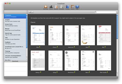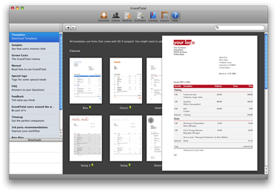It's also interesting to note that the Help part of GrandTotal also includes-in addition to the Screen Casts-FAQ's, templates and sample invoices, recommended 3rd party software such as PearLabelizer for printing labels, and VectorDesigner for creating layout backdrops and logos that are useful for enhancing the features that GrandTotal provides. This is Help area of application also includes the developer's blog, which also downloads from the developer's website into the window of the application. GrandTotal is both a stand-alone and companion application to Media Atelier's tracking software, TimeLog 4.