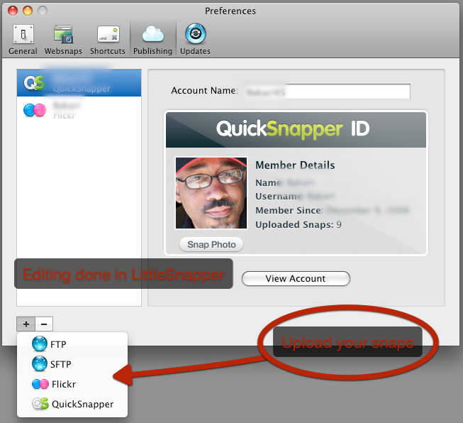Snapshots can of course be exported out as full PDF, JPEG, TIFF, and PNG files. And just like with iPhoto, you can drag selected snapshots out of LittleSnapper onto your desktop or into any other supporting application. This application also goes one step further and enables you to upload your snapshots directly to your Flickr account or to RealMac's QuickSnapper, a site designed to compliment the LittleSnapper desktop. LittleSnapper users can share, comment on, and search uploaded snaps by other members. Just as with images posted on Flickr or Picasa, QuickSnapper provides HTML link coding for each uploaded snap. If you're a Tweeter, you can post snaps directly from QuickSnapper to your account. You can of course FTP and SFTP publish snaps to your own webserver.