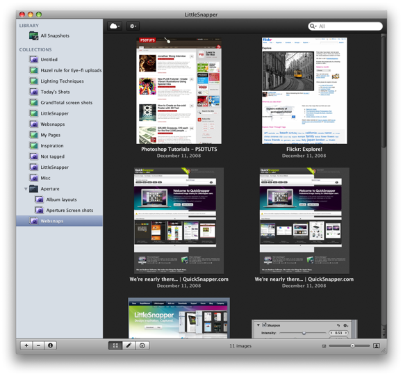 Though I don't snap entire entire web pages very often, that's exactly what LittleSnapper can do. In it's press release, Realmac explains it well: "LittleSnapper can take a snapshot of any given web address from its system-wide menubar item, through a customisable system-wide keyboard shortcut that snaps the current web address from a users' browser, or using the built-in LittleSnapper Browser. The built-in browser, based on the powerful WebKit rendering engine that powers Apple's Safari web browser, allows a user to load a web address inside the application itself and snap (for example) a site that has interactive Flash content and capture specific page elements without the need for cross-hairs with its intelligent element selection. LittleSnapper also allows the user to take full-screen, area and window-based screenshots on their Mac desktop, and the snaps are also added to the LittleSnapper library." This feature indeed has worked entirely well based on my testing.