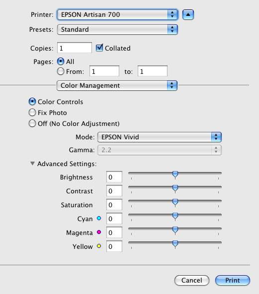 6. Advance Printer Settings: If the colors in your printed photos are not printing well, you will want to recheck your print settings to make sure they match your paper stock. You might also check and use the printer utility settings for nozzle and print head cleaning. And finally, you might check out the Color Management settings in the printer application. These advance settings are for adjusting the tones and colors of your photo, similar to adjustments you make in iPhoto, Aperture or Photoshop.