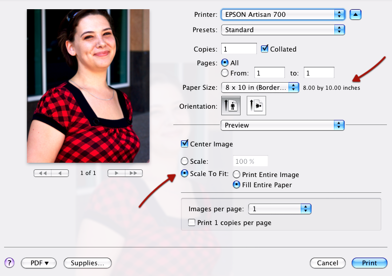 4. Scale to Fit: Many current printers will now print borderless photos. This is great if you plan to frame the photo. But my experience is that you will need to work with the Scale to Fit and Scale settings of your printer application in order to get the borderless print. Your paper size settings may also have an option for borderless prints. With the Leopard's current printing application, you get a perfect preview of how your photo will look before you print it.