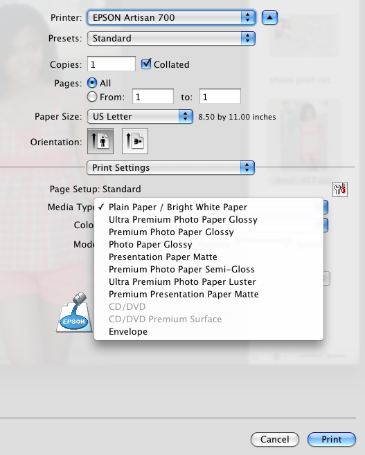 2. Photo Paper Stock: When you're printing photos, it's very important that you select the proper settings for the type of paper you're using. For example, if you use Premium Photo Paper Semi-Gloss, make sure you're not of course using Plain Paper/Bright White Paper setting. Your prints will come out horribly. Even using Photo Paper Glossy setting for Ultra Premium Photo Paper Glossy can produce poor results. You can preview the type of paper your print driver supports by selecting Print Settings>Media Type.