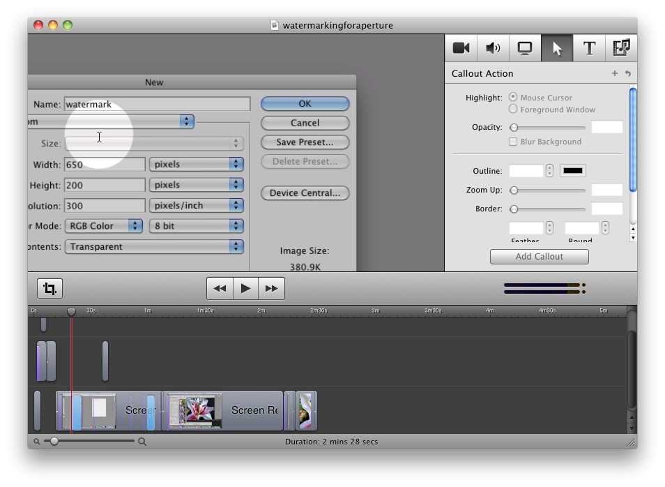 ScreenFlow‘s Callout feature is perhaps its trickiest and most unique feature. This feature simply allows you to highlight and direct the focus to any part of your screen capture. So for example, if you record actions of an entire application, but in some parts of the video you want to, say, zoom in on what you did in the menu bar of that application, you can simply create a callout that directs the viewers attention to that part of the screen. You can also turn your mouse actions into a highlighter. During the editing process, you can begin and stop these callouts wherever you like. This type of editing does require extra time and a little skill, but done effectively, it provides a professional touch to your productions.