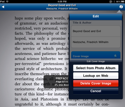 When you download a free book, it might not come with an illustrated cover, but Stanza has that covered—no pun intended. It provides a direct link to downloadable book covers. You can also add a custom book cover from your photo album.