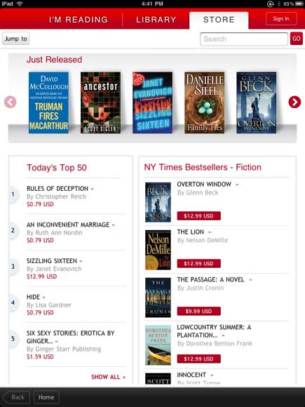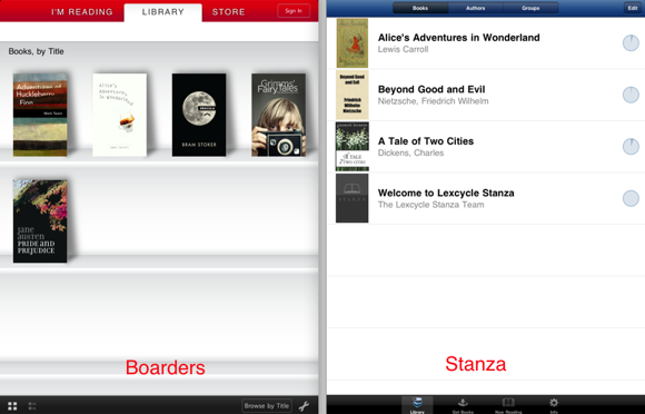 I won’t go in to detail about each of these apps because they share many of the features I’ve covered in other reviews and how-twos. Each app delivers a friendly user interface on the iPad, though of the two, the Borders‘s Library home page is more elegant, but not as feature rich.