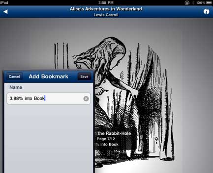 Like all e-readers, Stanza has a bookmarker tool but what makes it different is that you can customize the title of the bookmark which is helpful for noting why you bookmarked a certain page.