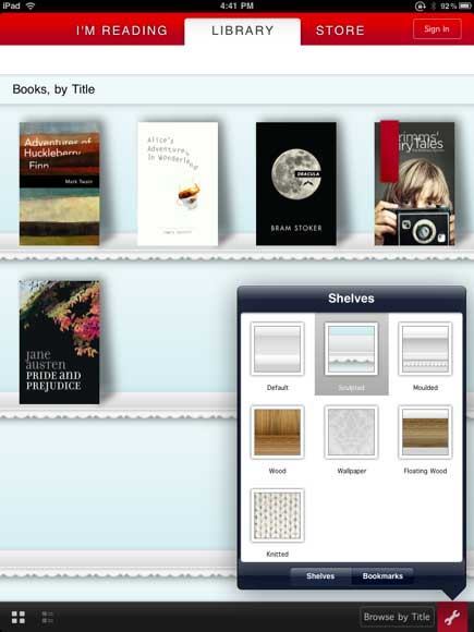 Borders looks to be the last major book seller to get into the e-book business. It recently released Borders eBook app for the iPad. It sports an elegant Library Home Page, which comes with seven different shelf styles, from the wood style to the more delecate Sculpted and Moulded style.