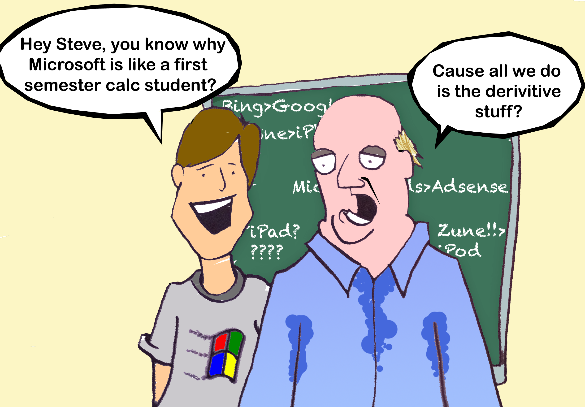 How does the still mighty Microsoft become so irrelevant in such an important market? It seems Microsoft has become obsessed with stats instead of products. Recall when Mr. Ballmer said "Apple sold more iPads than I'd like them to sell." When speaking to analysts. That statement tells you all you need to know about the corporate governance and corporate mindset of Microsoft. This is a company who has stopped worrying about making the next great thing, a company that has stopped worrying about making the best product possible and started hoping everyone else sucks more.