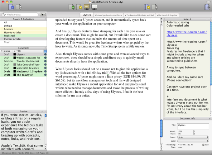 Apple’s TextEdit, that comes installed with Leopard, simply does not cut the mustard for anyone who writes on a regular basis. It is a great, simple to use text editor for occasional writing, but it provides nothing in way workflow management. Apple also provides a more advanced word processor, Pages, but like its counterpart, Microsoft Word, it can be a little too clunky to use, and it also lacks workflow management.