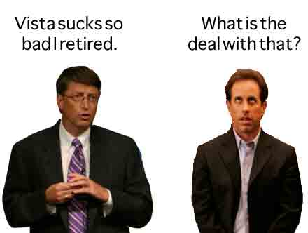 Microsoft's response to the varied perceived failures? They've decided to roll out ads with Bill Gates and Jerry Seinfeld. Microsoft will probably deny it but it is obvious that the ads are a direct response to Apple's Get a Mac Ads which have managed to capture the imagination of the young and hip or the not so young with a yearning to be hip. The logic is a glorious failure. If you're trying to undo what Apple has wrought rolling out someone on the downside of their career along with a retired guy is not the best tactic. One imagines the ads will look something like this: