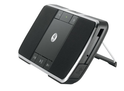 The black and silver design of the unit is unobtrusive, and it's about the same size as the iPhone itself. Plus there's a little flip-out kickstand that provides hands-free functionality. Another nice feature is that you can switch between iPhone speakers and the Motorola wireless speakers without having to open up the settings menu on the iPhone.